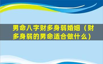 财多 🕊 身弱的男命,往往婚姻坎坷不顺。他,们。容,易,遇,到财。旺克身的女命导致克妻或婚变财星过旺也容易使命主沉迷于赚钱忽略家庭不利于夫妻感情的稳定
